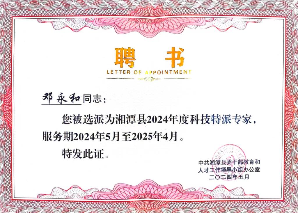邓永和教授是湖南省新世纪121人才,湖南省高校青年骨干教师,湖南省和益阳市专家工作站首席专家,湘潭市高端人才,湘潭市新型工业化高级人才,湘潭市、县科技特派专家。2023年,其作为首席专家的湖南科鑫泰电子有限公司专家工作站帮助公司更高效的突破对钽酸锂新材料的黑化工艺的研究,提升公司技术创新和产品竞争力,成功入选湖南省专家工作站名单。